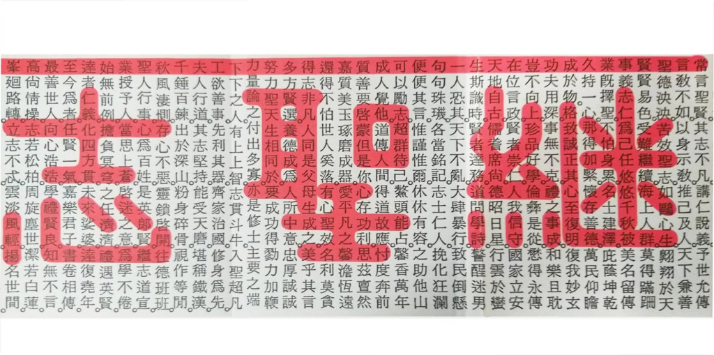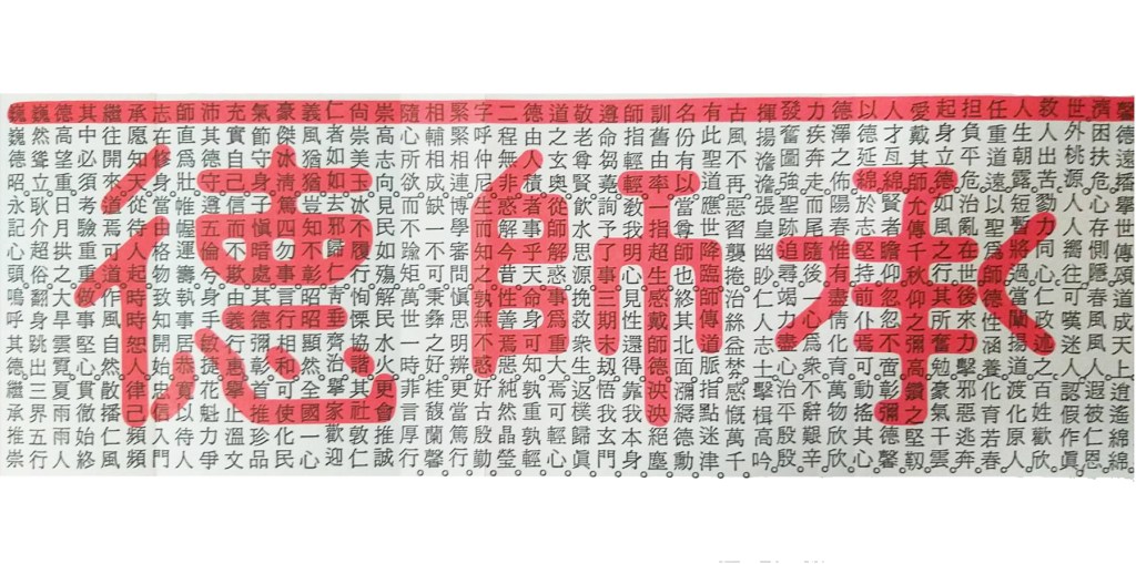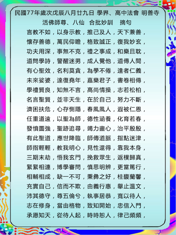 言教不如,以身示教,推己及人,天下兼善,懷存善德,萬民仰瞻,格致誠正,復我妙玄,功夫用深,事無不克,禮之事成,和樂且耽,道問學詩,警醒迷男,成人覺他,道傳人間,有心聖效,名利莫貪,為學不倦,達者仁義,未來娑婆,達復堯年,嘉樂君子,書卷相傳,學禮賢良,知無不言,高尚情操,志若松柏,名言聖賢,並非天生,在於自己,努力不斷,濟困扶危,心存惻隱,春風風人,遐被仁恩,任重道遠,以聖為師,德性涵養,化育若春,發憤圖強,聖跡追尋,竭力盡心,治平殷殷,有此聖道,應世降臨,師傳道脈,指點迷津,師指輕輕,教我明心,見性還得,靠我本身,三期末劫,悟我玄門,挽救眾生,返樸歸真,緊緊相連,博學審問,慎思明辨,更當篤行,相輔相成,缺一不可,秉彝之好,桂馥蘭馨,充實自己,信而不欺,由義行惠,舉止温文,沛其德守,尊五倫兮,執事居恭,寬以待人,志在修身,當由格物,致知開始,忠信入門,承愿知天,從待人起,時時恕人,律己頻頻,繼往開來,道焉可道,作風自然,散播仁風,其中必須,考驗重重,做事堅心,貫徹始終,德高望重,耿介超俗,翻身跳出,三界五行,巍巍德昭,永記心頭,嗚呼其德,繼承推崇。