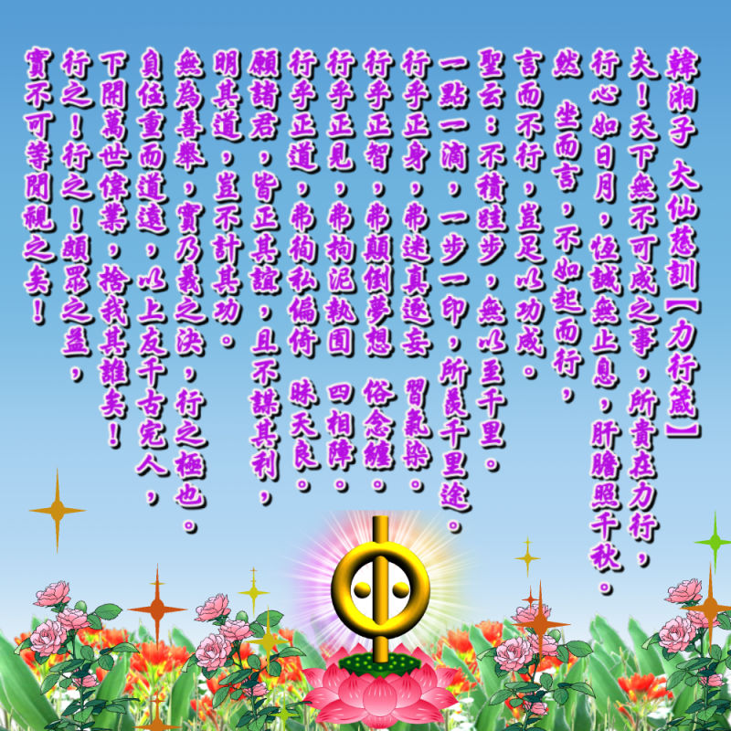 韓湘子 大仙慈訓【力行箴】 夫!天下無不可成之事, 所貴在力行,行心如日月, 恆誠無止息,肝膽照千秋。 然 坐而言,不如起而行, 言而不行,豈足以功成。 聖云:不積跬步,無以至千里。 一點一滴,一步一印,所羨千里途。 行乎正身,弗迷真逐妄 習氣染。 行乎正智,弗顛倒夢想 俗念纏。 行乎正見,弗拘泥執囿 四相障。 行乎正道,弗徇私偏倚 昧天良。 願諸君,皆正其誼,且不謀其利, 明其道,豈不計其功。 無為善舉,實乃義之決,行之極也。 負任重而道遠,以上友千古完人, 下開萬世偉業,捨我其誰矣! 行之!行之!頗眾之益,實不可等閒視之矣!